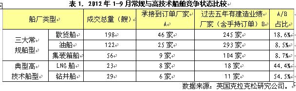 第三,與油氣勘探、開采、生產(chǎn)、運輸環(huán)節(jié)相關(guān)船型與海工裝備市場表現(xiàn)相對活躍。不完全統(tǒng)計,2012年1-9月全球累計成交各類船舶(含海工裝備)金額約590億美元,其中,與油氣勘探、開采、生產(chǎn)、運輸相關(guān)船舶與海工裝備等產(chǎn)品(油船、LNG船、LPG船、鉆井船、各類平臺、海工輔助船等)合計成交金額達456億美元,占總量78%,僅海工裝備成交總金額就高達355億美元,占總量比重高達60%。海工裝備市場的活躍對有效阻止船舶市場整體行情進一步下滑起到重要的支撐作用。