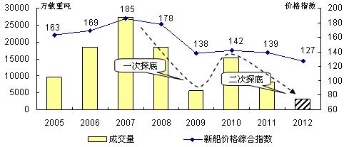 當(dāng)人們欣喜看到2010年船舶市場“強勁復(fù)蘇”,寄希望2011年仍能保持這種態(tài)勢的時候,2011年世界經(jīng)濟、貿(mào)易、航運市場風(fēng)云突變,船舶市場外部環(huán)境再度發(fā)生惡化,加上隱藏于船舶市場船舶產(chǎn)業(yè)深層次矛盾與問題的不斷暴露,船舶市場重返下行通道,2012年這種情況變得更為糟糕。按克拉克松公司統(tǒng)計,2012年1-9月全球累計成交新船訂單781艘、3230萬載重噸,月均360萬載重噸,較上一年月均成交量下滑46%,甚至比2009年月均水平(上次谷底)還低25%,呈典型“二次探底”之勢。隨著成交量的持續(xù)萎縮,新船價格進一步下滑,2012年9月底克拉克松新船價格指數(shù)報收于127點,較上年底下跌12點,并創(chuàng)下2008年價格下行以來的新低。