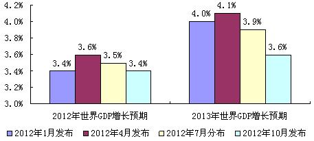 2012年一季度,在世界各國聯(lián)手干預(yù)政策及短期負面因素消失的推動下,世界經(jīng)濟下滑趨勢與通脹風(fēng)險得到一定程度受控。4月份,國際貨幣基金組織甚至上調(diào)了全球經(jīng)濟增長預(yù)期。但是,進入到二季度,因希臘與西班牙問題再度重演,歐債危機再度惡化,對世界實體經(jīng)濟產(chǎn)生了新的負面影響。歐美發(fā)達經(jīng)濟體復(fù)蘇緩慢,中、印度等大宗商品需求國經(jīng)濟增速回落超預(yù)期,再度把世界經(jīng)濟推向“二次探底”的邊緣,7月份IMF下調(diào)了全球經(jīng)濟增長預(yù)期,經(jīng)濟發(fā)展前景頓時再生變數(shù)。進入三季度,二季度產(chǎn)生的不利因素對實際經(jīng)濟影響進一步深化,全球經(jīng)濟體出現(xiàn)罕見的同步下滑態(tài)勢,新興經(jīng)濟體一直以來作為全球經(jīng)濟復(fù)蘇的貢獻者,也因外需疲軟,內(nèi)需動力減弱而呈明顯的下降趨勢,鑒于此,10月份IMF在7月份的預(yù)測基礎(chǔ)上再度下調(diào)了今明兩年經(jīng)濟增長預(yù)期。