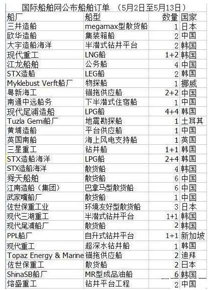 根據(jù)國際船舶網(wǎng)公布的5月2日至5月13日的船舶訂單來看,鉆井船和液化船高端領域的表現(xiàn)異常搶眼;中日韓仍然是世界上訂單最為活躍的三個國家。其中,韓國在高端造船上顯示出“誰與爭鋒”的氣勢,中國在高端領域亦有所收獲,但仍然以傳統(tǒng)造船為主,日本已經走環(huán)保路線。