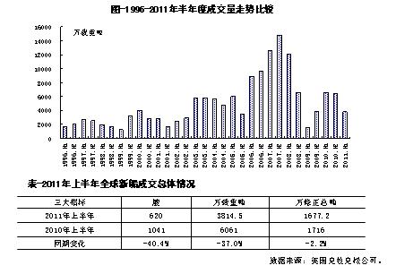 第二,2011年新船成交量將再度大幅回落。按1-6月成交態(tài)勢(shì)測(cè)算,今年全年成交量大致在8000萬載重噸左右,較上一年下滑幅度極有可能超過40%。