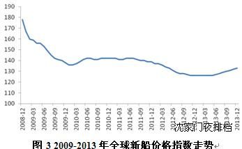 新船成交量的回落必然導(dǎo)致新船價格上升動力逐漸趨弱,但短期內(nèi)新船價格走低的可能性也不大。由于2013年成交量的大幅增長,大型船廠的接單壓力大幅緩解,部分船廠開始選擇性接單,提價逐漸成為共識。此外,新的經(jīng)濟(jì)增長周期正在逐步形成,原材料價格的小幅上漲和勞動力成本的剛性抬升均對船舶制造成本產(chǎn)生有力支撐。在這種情況下,預(yù)計(jì)2014年上半年,新船價格有望繼續(xù)緩慢上漲;2014年下半年開始,新船價格上升動力將逐漸減弱,保持平穩(wěn)的可能性較大。
