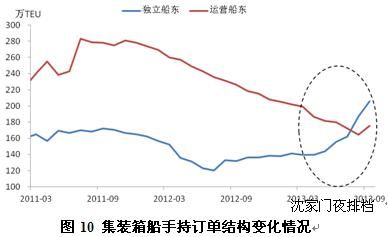 集裝箱船方面,班輪公司在上一輪大型船訂造熱潮中,主要通過自有資金進(jìn)行訂造。隨著班輪公司運(yùn)力升級的持續(xù)推進(jìn),新一輪訂造在2012年末再次啟動,推動集裝箱手持訂單量開始回升。但由于班輪公司運(yùn)營持續(xù)艱難,自有資金訂造能力受到大幅削弱,卻又不得不進(jìn)行運(yùn)力升級以保持市場份額,從而借助獨(dú)立船東的力量發(fā)展運(yùn)力,導(dǎo)致集裝箱船手持訂單的結(jié)構(gòu)發(fā)生很大變化,獨(dú)立船東手持訂單量逐步超過運(yùn)營船東,同時也推動融資租賃交易數(shù)量和融資額大幅增長。