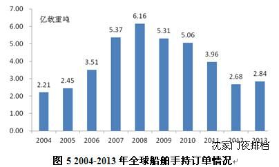 隨著全球造船完工量的回落和新船成交量的強(qiáng)勁反彈,全球船廠手持船舶訂單實(shí)現(xiàn)了危機(jī)以來年份的首次增長。截止2013年底,全球船廠手持訂單為4896艘、2.84億載重噸,載重噸位同比增長6.0%。具體到月份,2013年3月底,全球船舶手持訂單下降到2.52億載重噸的階段性低點(diǎn),之后在新船成交量反彈的推動下持續(xù)回升。