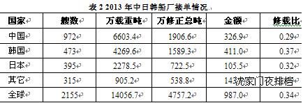 2013年,中國船廠接單總量依然保持全球第一,接單金額與韓國存在差距。以艘、載重噸和修正總噸計(jì)算,中國船廠的市場份額分別為45.1%、47.0%和40.1%,分別高于韓國船廠23.2、16.6和6.7個百分點(diǎn);但按照接單金額計(jì)算,中國船廠的市場份額僅為33.1%,低于韓國船廠41.6%的市場份額,修載比也遠(yuǎn)低于韓國船廠。這反映了中國船廠在高價值船舶承接上仍處于相對弱勢。