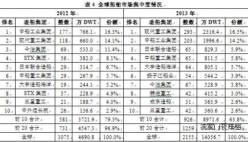 2013年,全球造船市場接單集中度保持高位,前10家造船集團(tuán)承接量占比為63.8%,前20家合計(jì)占比為78.6%,與2012年相比有所下滑,主要原因是成交量的大幅反彈為不少前期接單困難的大中型船廠帶來訂單。